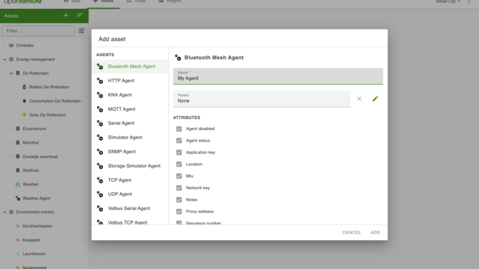 Protocol Agents connect external devices and services. Generic protocols as HTPP, SNMP, MQTT, Bluetooth, Serial, TCP, UDP, Z-wave are included, as well as vendor specific ones like KNX and Velbus. Create your own via a custom project.