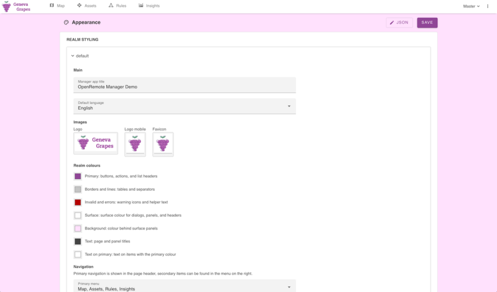 Using the Appearance settings you can easily change logo’s and color styling for each of the realms. Also set the navigation items, default languages, asset types, and how icons are shown on the map.