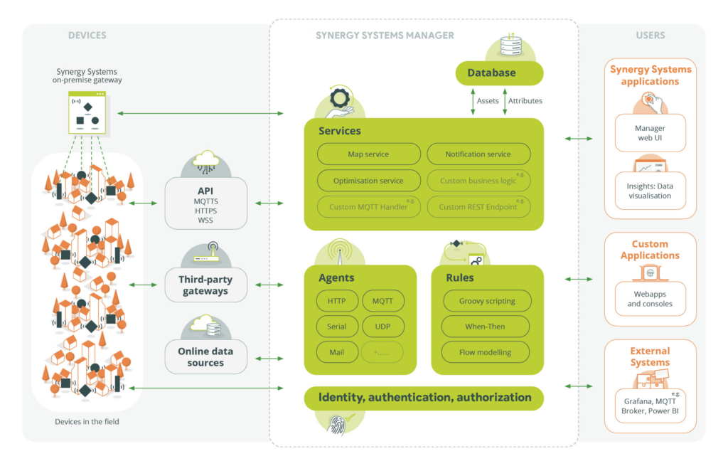 Synergy Systems is an intuitive user-friendly bespoke and open source IoT device management platform for the private sector, public sector, and integrators. It includes all functions and features from connecting devices to building application and domain specific smart applications. Here’s an overview of the main functions and features.